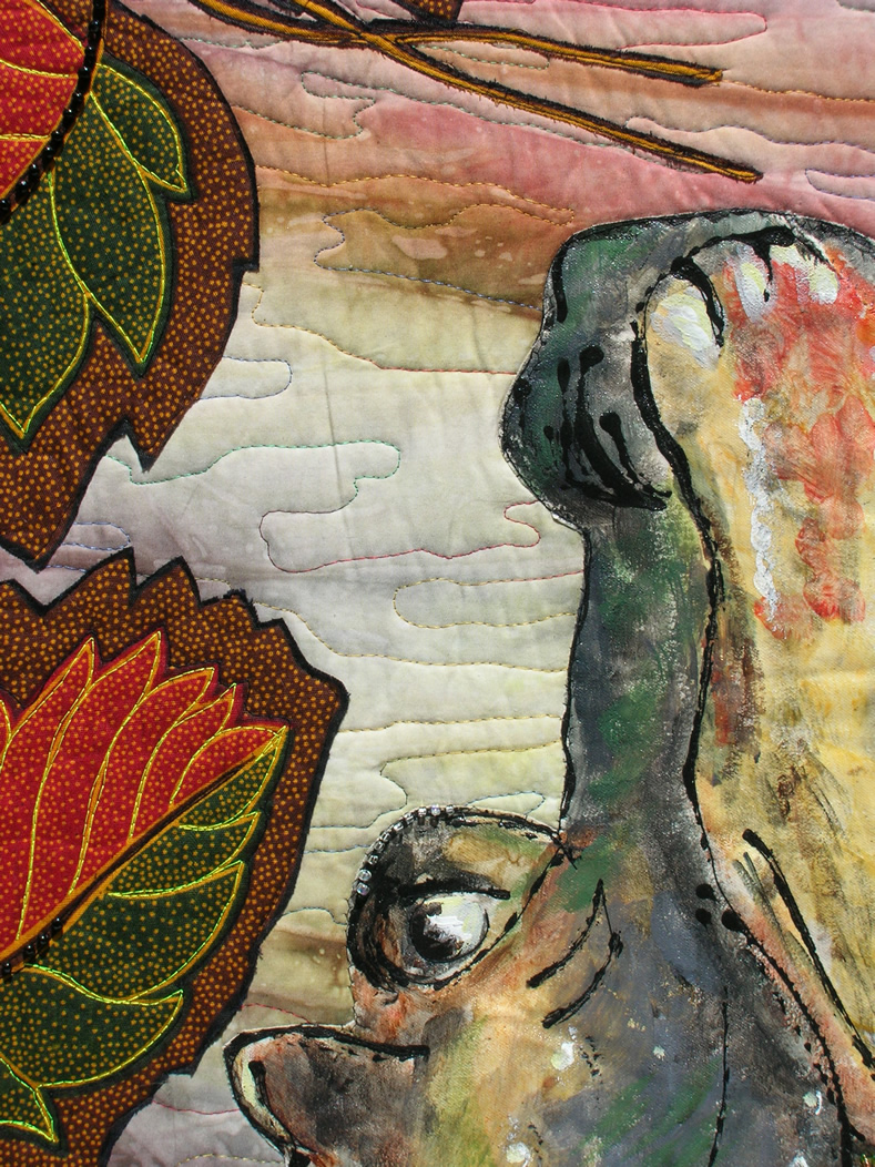 East African cloth was purchased in a small village marketplace in Tanzania. The hippo was painted on canvas, placed on hand-dyed cloth and encircled by richly patterned East African cottons. Images 2010, Lowell Quilt Festival, Lowell, MA 2010 Tappan Z Gallery, Tarrytown, NY $700 |